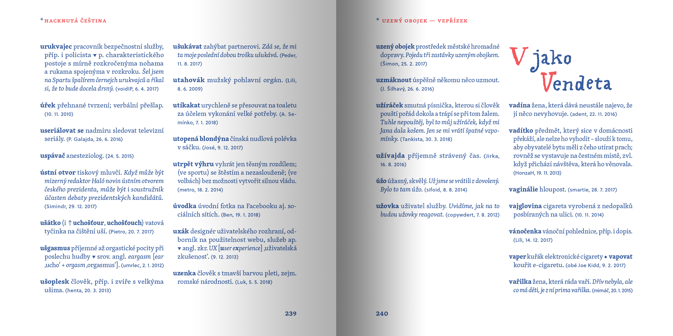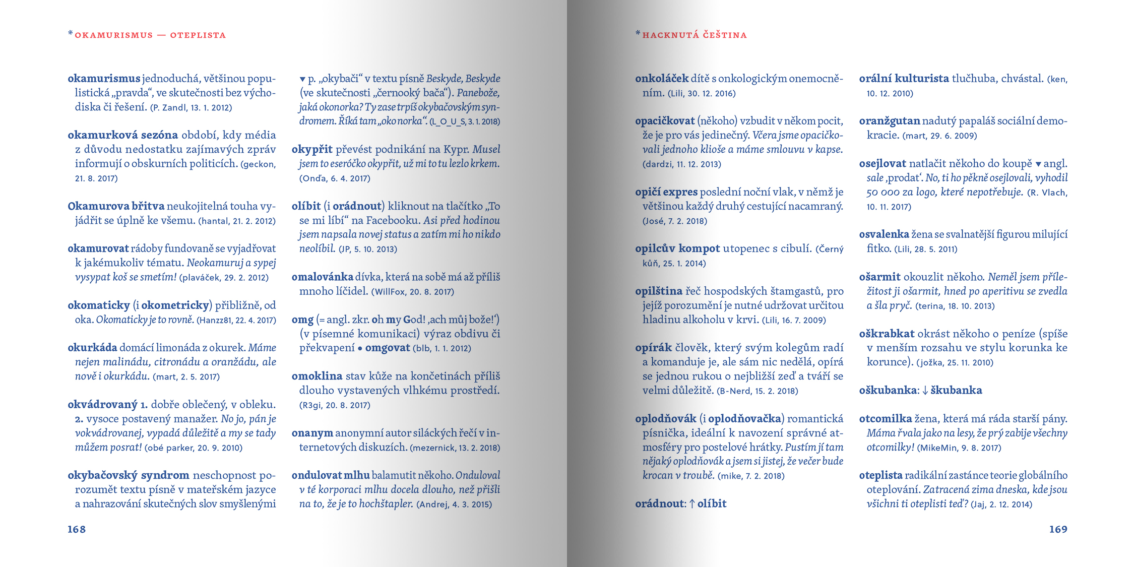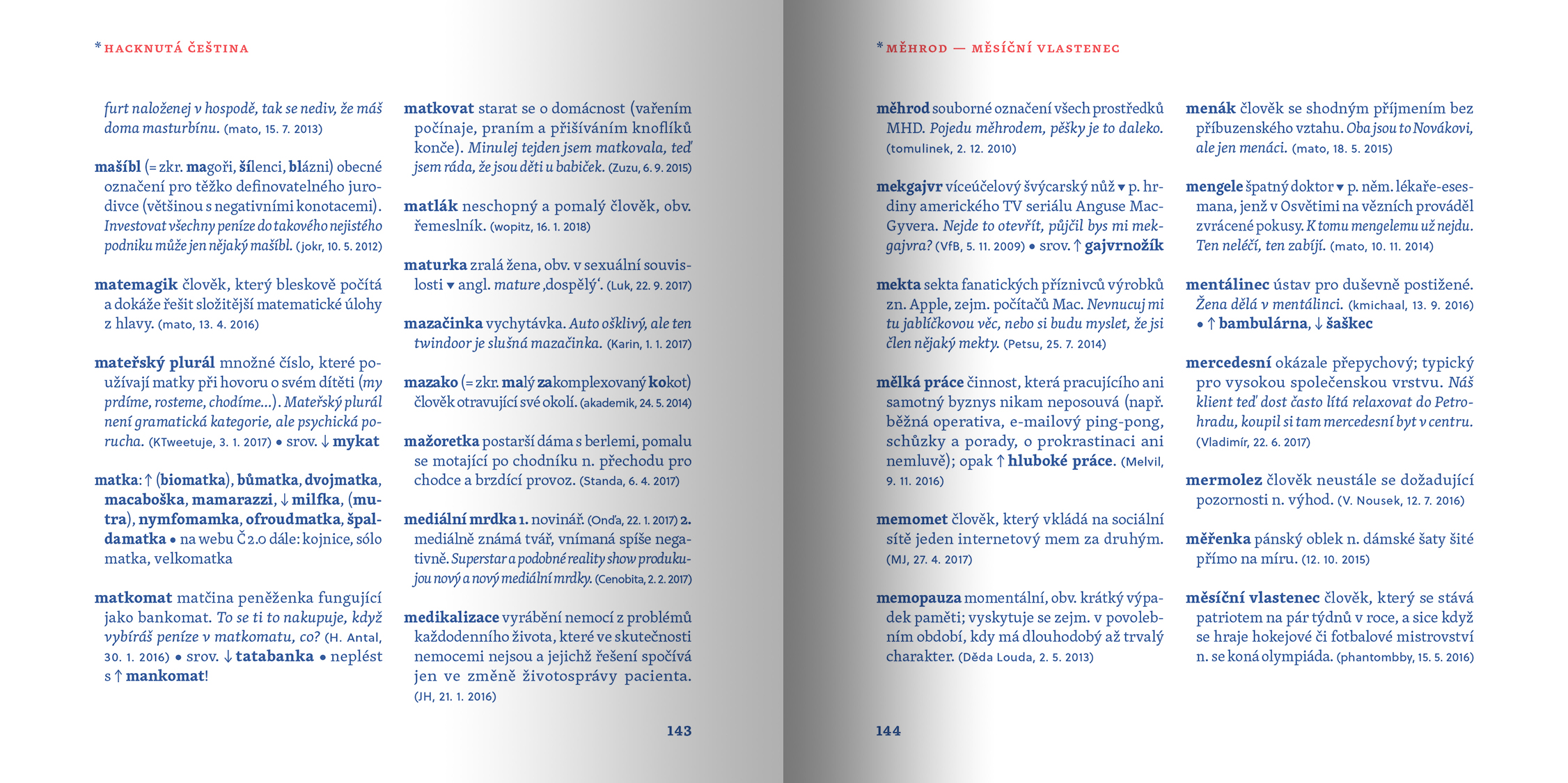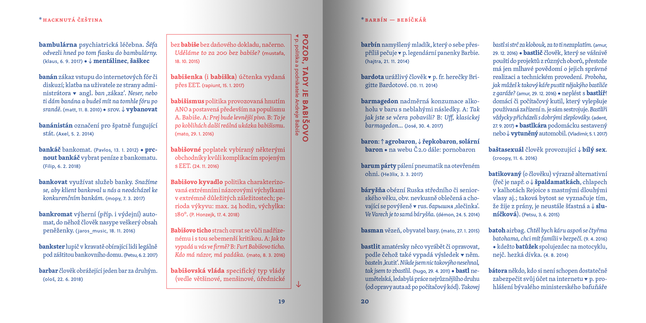 Slovník hacknuté češtiny si nejen užijete, ale navíc si díky němu obohatíte slovní zásobu. Zjistíte, kdo je krachonoš, vadína, surikata, řvoused nebo kontokorentiér, co obnáší mít čvančary, memopauzu, chcavenku či kurvítko a co znamená jet haldy, milošekunda, nánotechnologie, alzaheimer nebo třeba benevtip.