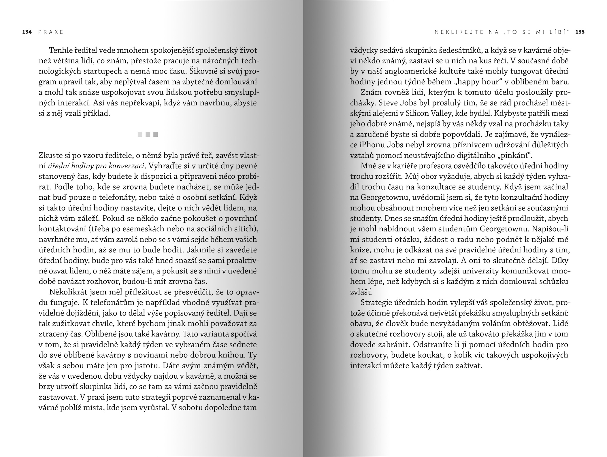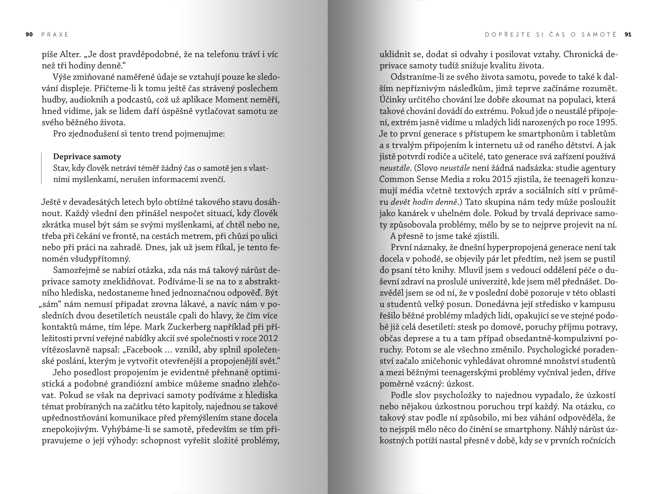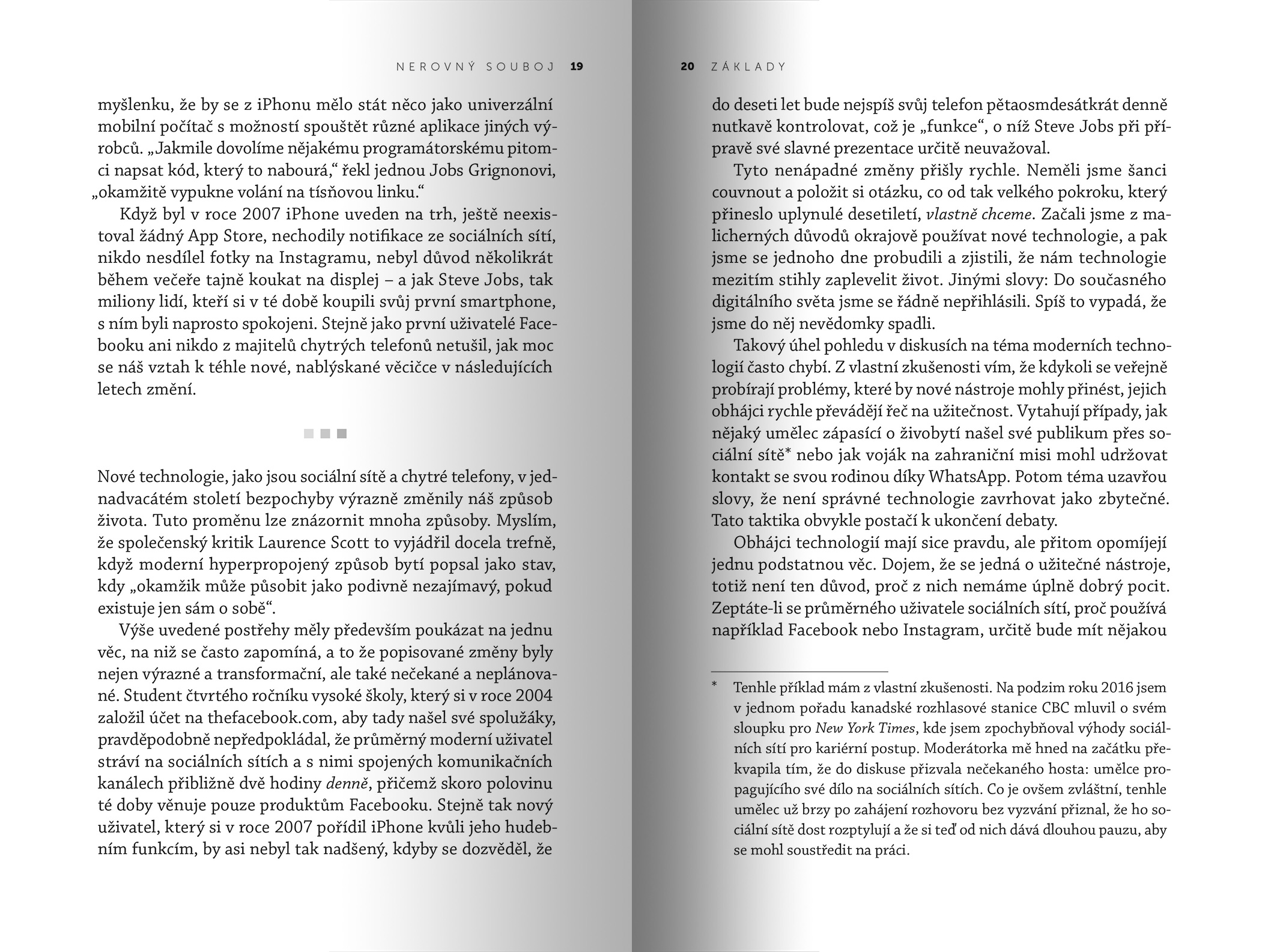 Díky knize si uvědomíte, že jsme vlastně ani neměli šanci naučit se odolat něčemu tak lákavému, jako je stále přístupný a stále zábavný online svět. Vždyť technologie, které to umožňují, jsou staré jen o něco málo víc než deset let. Stali jsme se pokusnými králíky nových médií, užili jsme si to, nyní však přišel čas zbavit se svých drobných závislostí. V součtu nám totiž měsíčně kradou desítky hodin života.