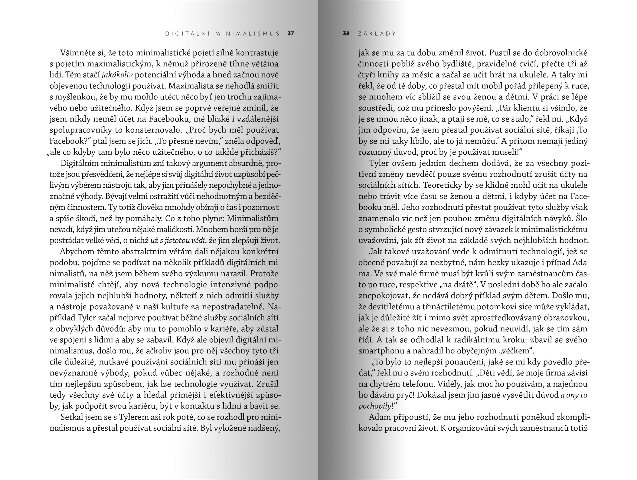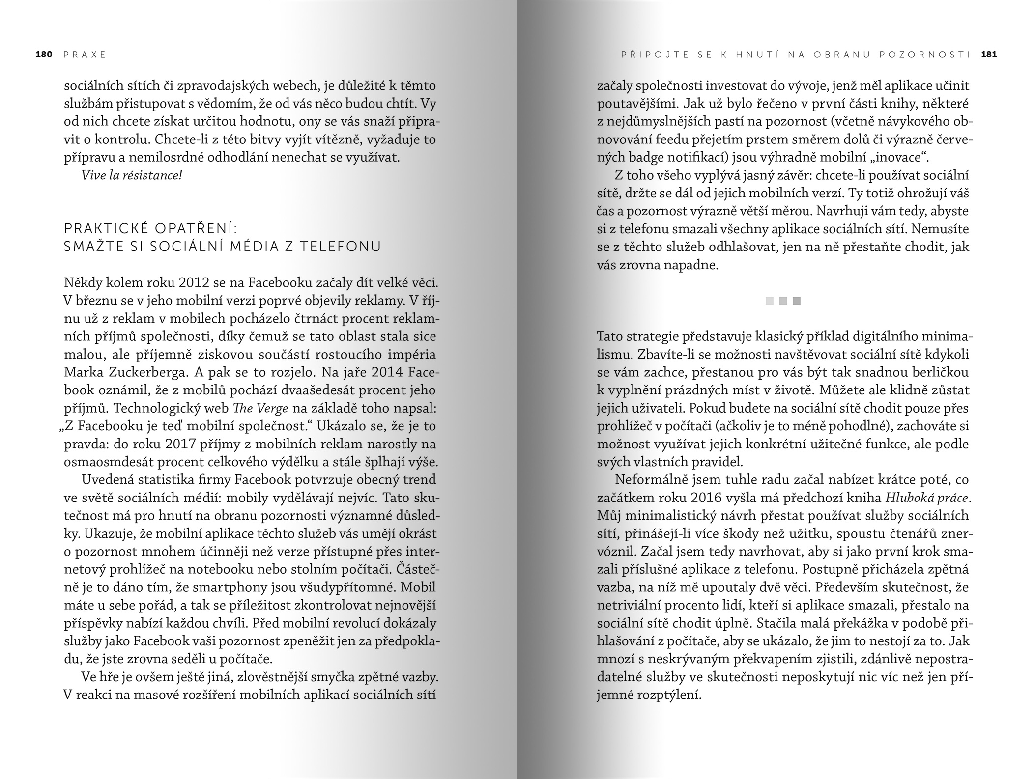 „Digitální minimalismus je vlastně mnohem dosažitelnější než různé koncepce zarputilé obrany proti technologiím, kterých je všude plno a které člověka nutí zahodit mobil do řeky, aby si zachránil mozek, dokud je ještě čas.“ — GQ