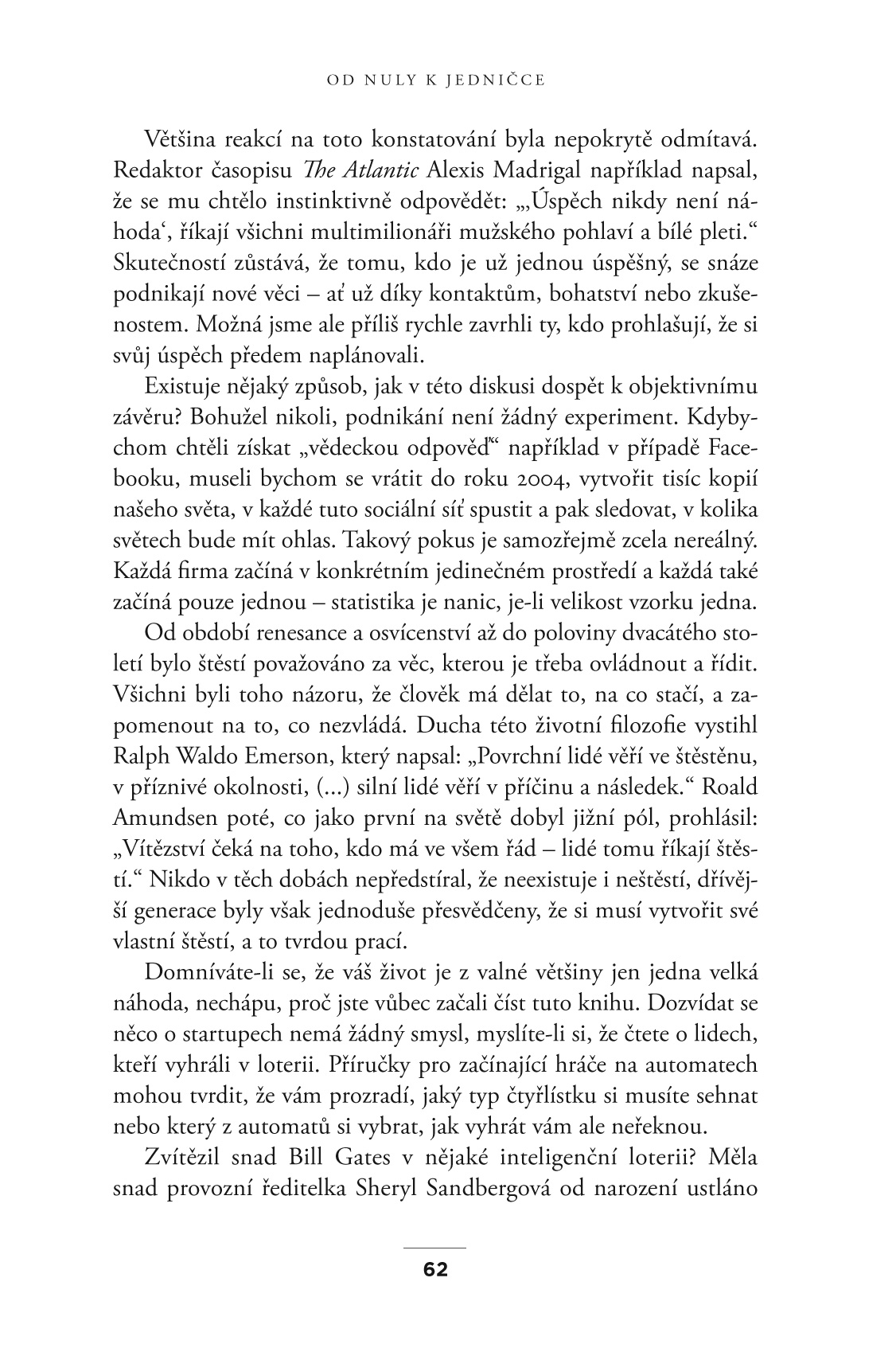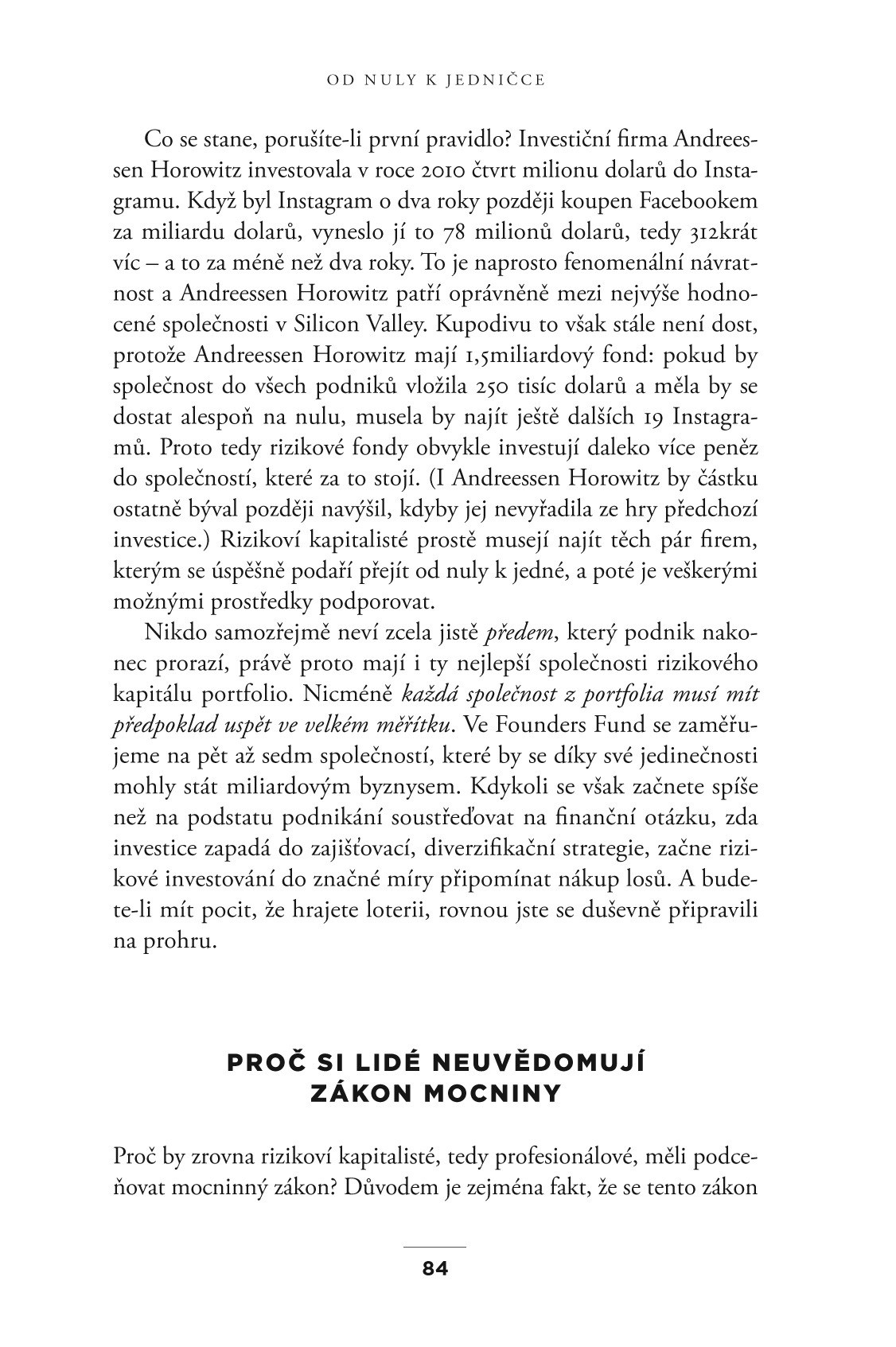 V této knize Peter Thiel ukazuje, jak najít ty nepozoruhodnější cesty k vytvoření něčeho nečekaného. Radí bádat i v doposud neprozkoumaných oblastech a pátrat po nápadu, který bude tím velkým skokem od nuly k jedničce. Pomůže vám zefektivnit rozhodování a zhmotnit originální myšlenku, díky které se nemusíte obávat konkurenčního tlaku, díky níž můžete veškerou energii věnovat vývoji, zaměstnancům a své vizi.