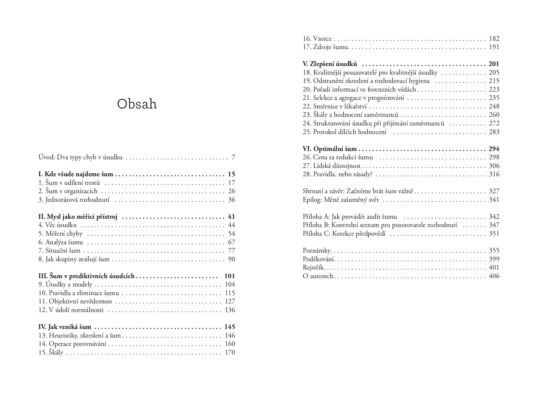 Kahneman s kolegy analyzoval stovky studií týkajících se rozhodování a ve svém společném díle vás přesvědčí, že i když máme tendenci své mentální schopnosti přeceňovat, jsme jako lidé velmi omylní. I model nás samých činí přesnější úsudky než my! Což není naší chybou, spíše přirozeností kauzálního myšlení a složitostí světa, chybou by však bylo ignorovat protiopatření. V knize vám hvězdný tým autorů vysvětlí příčiny vzniku šumu, jeho kategorie, odliší jej od zkreslení, naučí měřit jeho vliv, ale především ukáže, jak s těmito zjištěními naložit v praxi. Tedy jaké kroky po auditu šumu v rámci šesti pravidel rozhodovací hygieny podniknout. Pro lepší, spravedlivější, méně zašuměný svět.