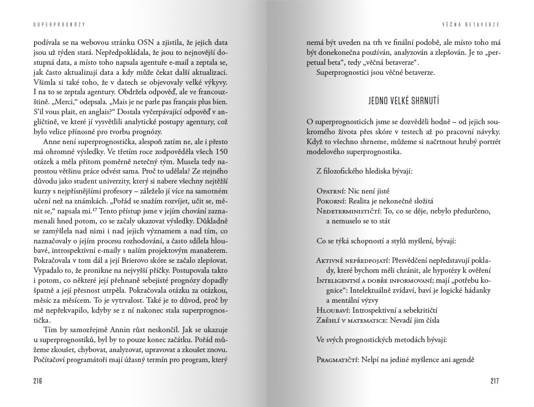 V této průlomové a čtivé knize autoři ukazují, co a jak se od této výjimečné skupiny můžeme naučit. Superprognózy nabízejí první prokazatelně účinný způsob, jak zlepšit naši schopnost předpovídat budoucnost – a to v podnikání, finančnictví, politice, mezinárodních vztazích i každodenním životě.