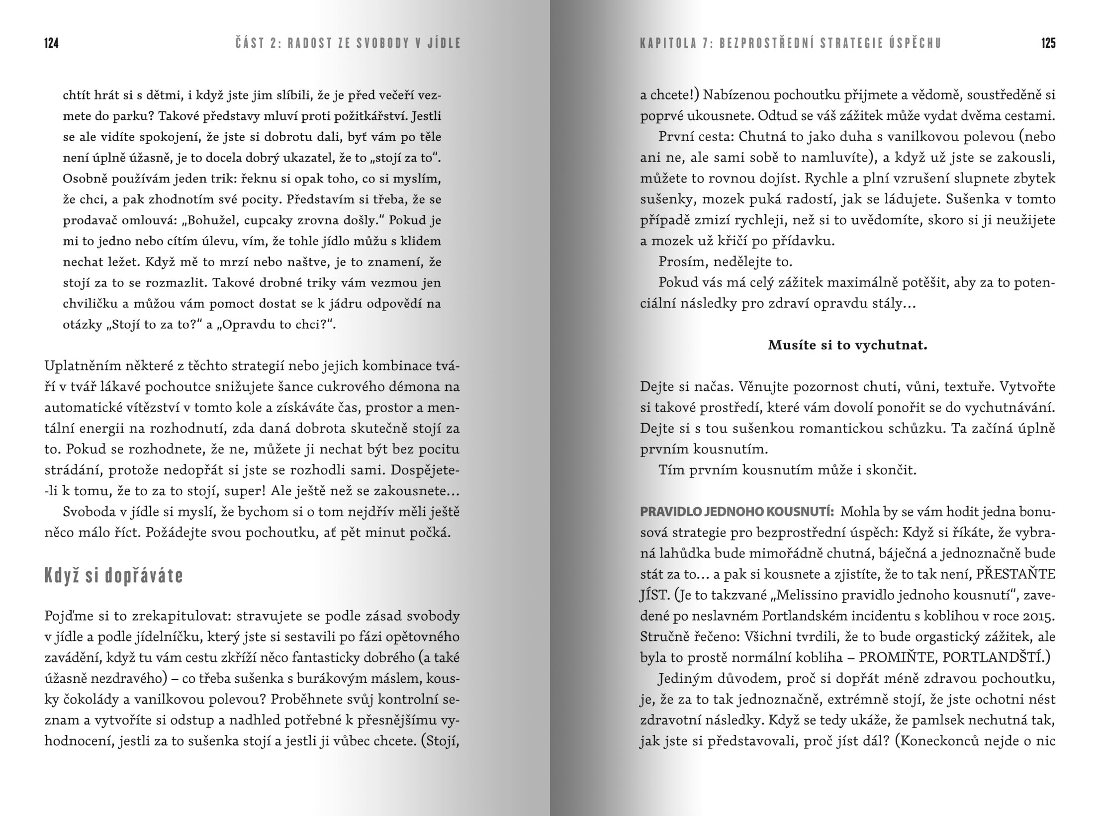 Kniha je prostoupená Melissinou proslulou tvrdou láskou a vtipem. Je nabitá postupy, které sama vyzkoušela anebo analyzovala díky zpětné vazbě od svých klientů a tisíců čtenářů. Ukáže vám, jak získat svobodu v jídle, i když se možná cítíte úplně bezmocní. Zdravý vztah k jídlu si zasloužíte!