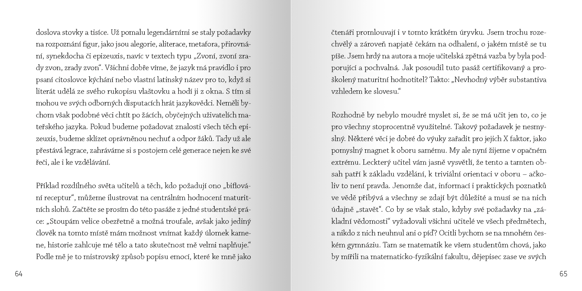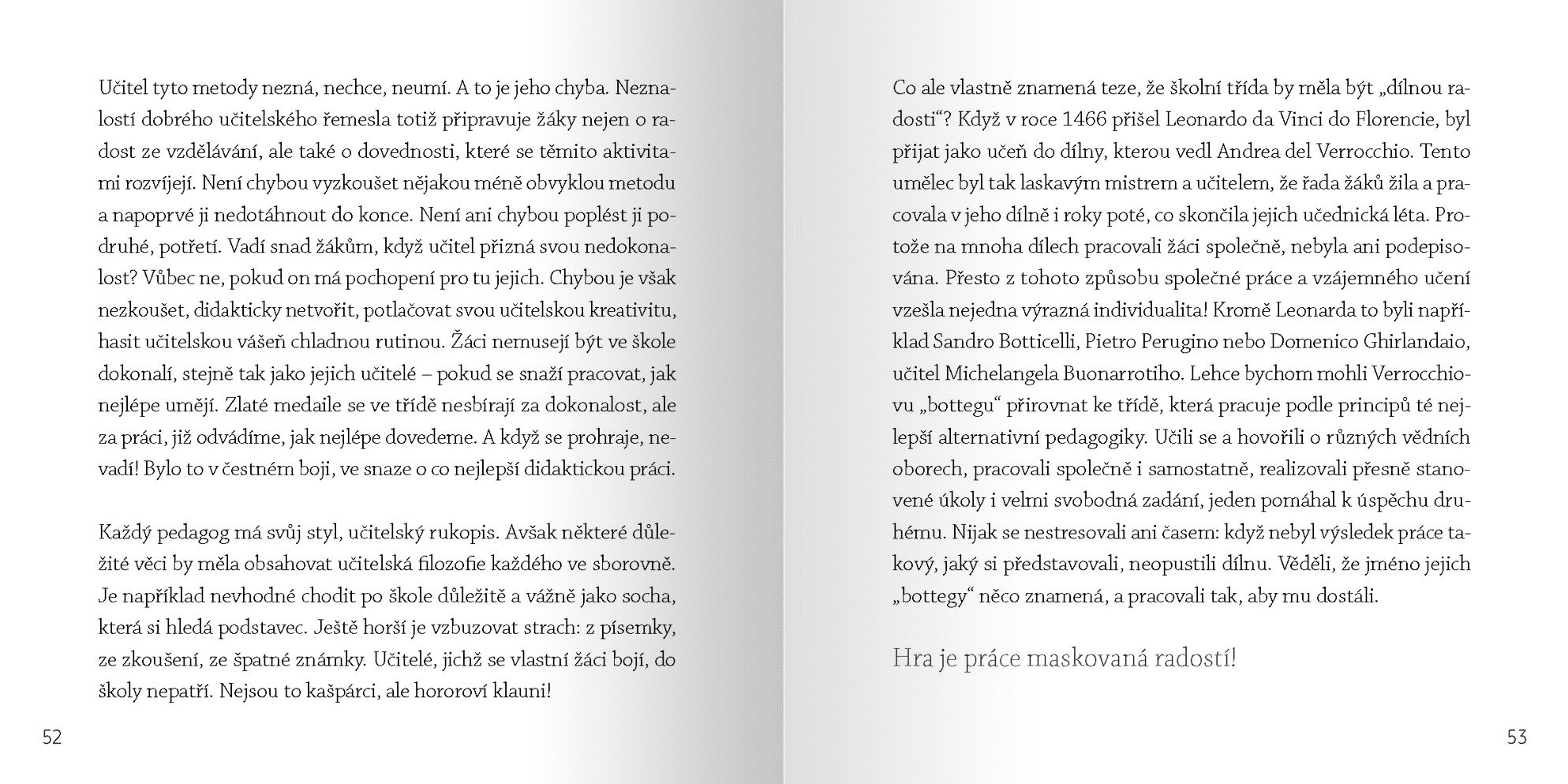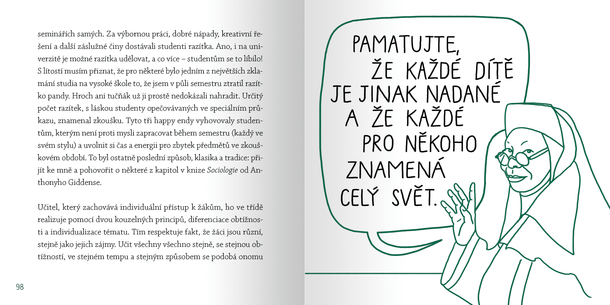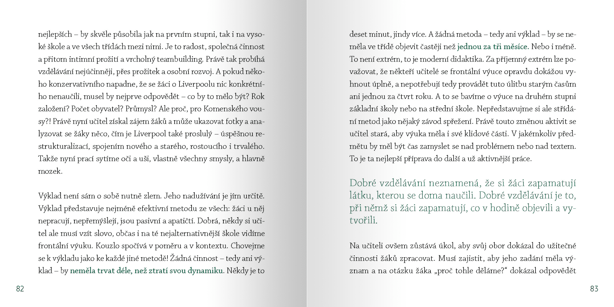 Frontální výuka, náročná domácí příprava a hodnocení dané průměrem známek nemají podle autora v českém školství místo. Vysvětlí vám, že zdaleka nejvíce se žák naučí při tzv. činnostním učení, tedy ve chvíli, kdy si poznatky a zkušenosti osvojuje vlastní cestou. Z toho by měl vycházet i učitel, který může používat pro podporu odlišných stylů žáků řadu různých metod, od týmové spolupráce až po velmi efektivní vzájemné učení. Nikdy by naopak neměl žáky srovnávat mezi sebou nebo jim dávat špatné známky.