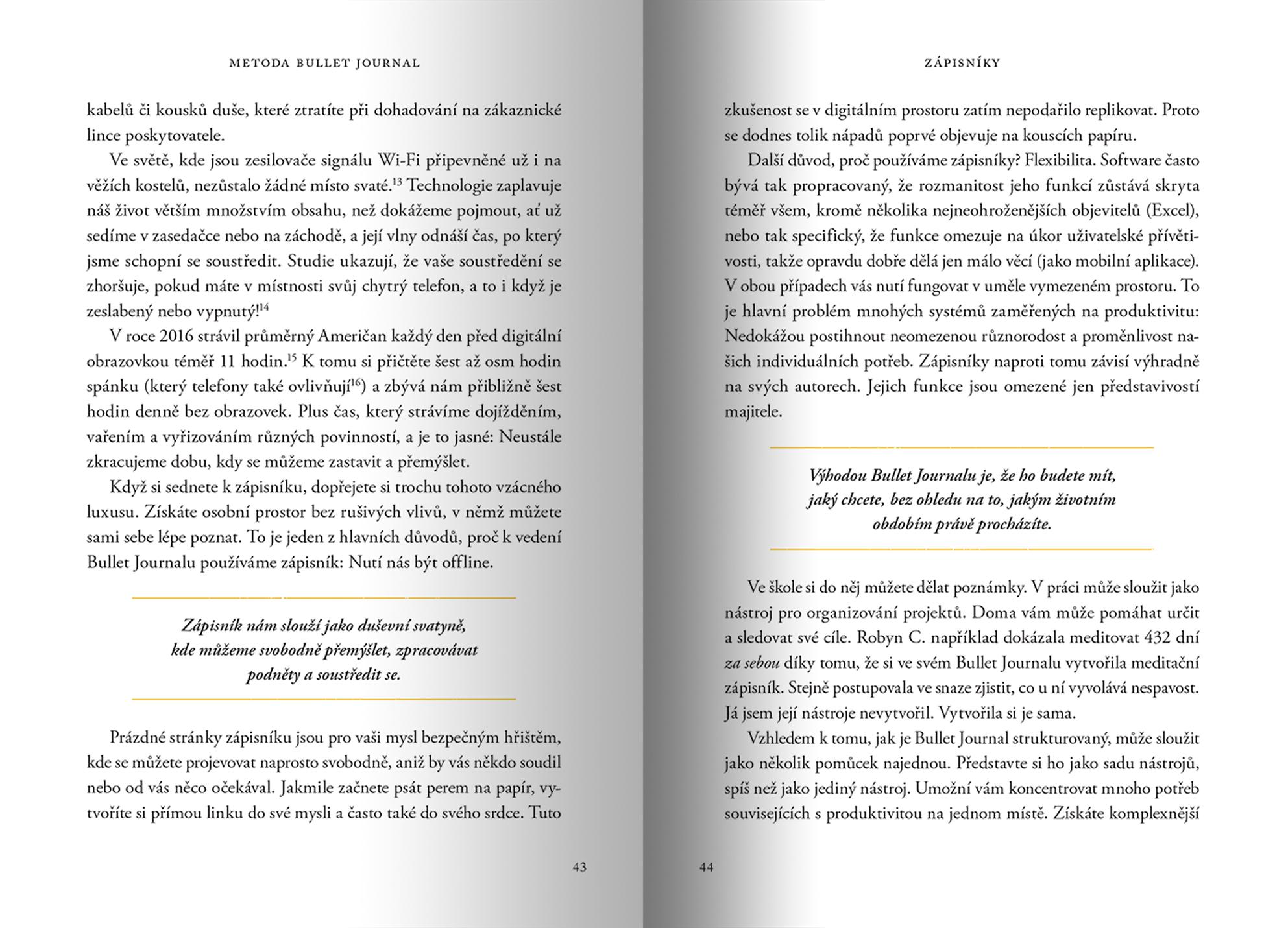 „Systém Bullet Journalu je jedním z nejelegantnějších a nejefektivnějších metod produktivity, se kterým jsem se kdy setkal. Nejenže vám pomůže s organizací úkolů, ale pomůže vám najít své lepší já. Bezvýhradně doporučuji všem, kteří chtějí od života víc.“ — Cal Newport, autor knihy Hluboká práce