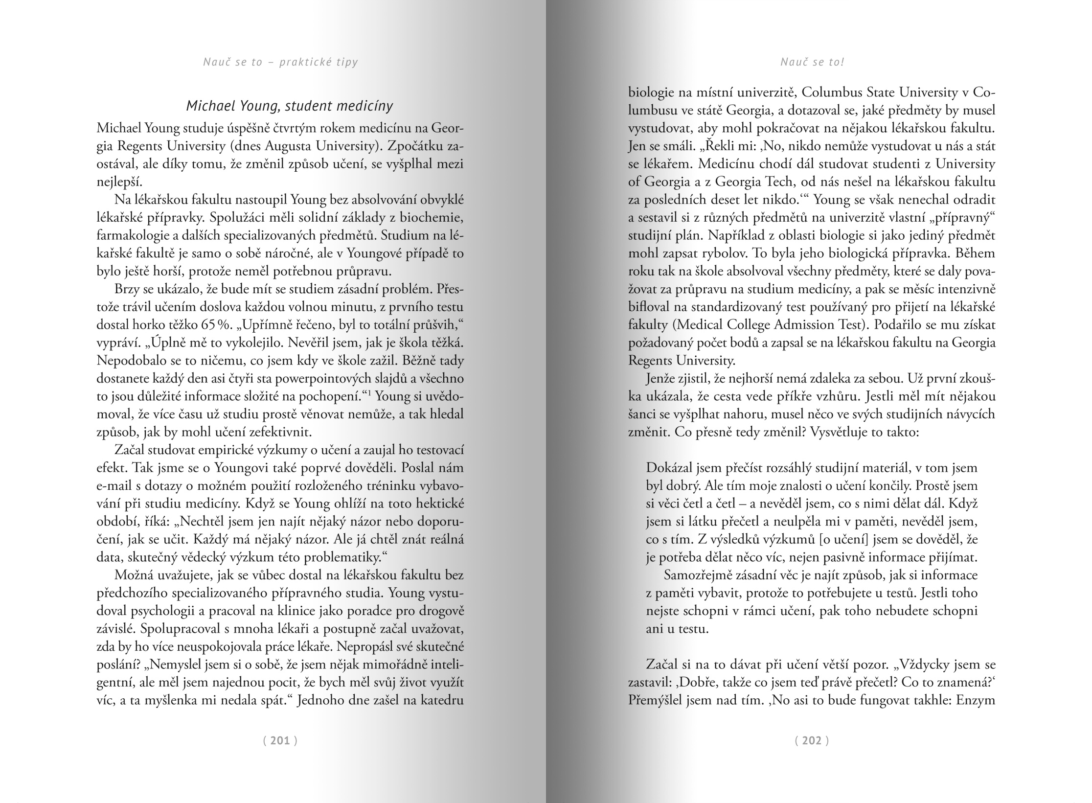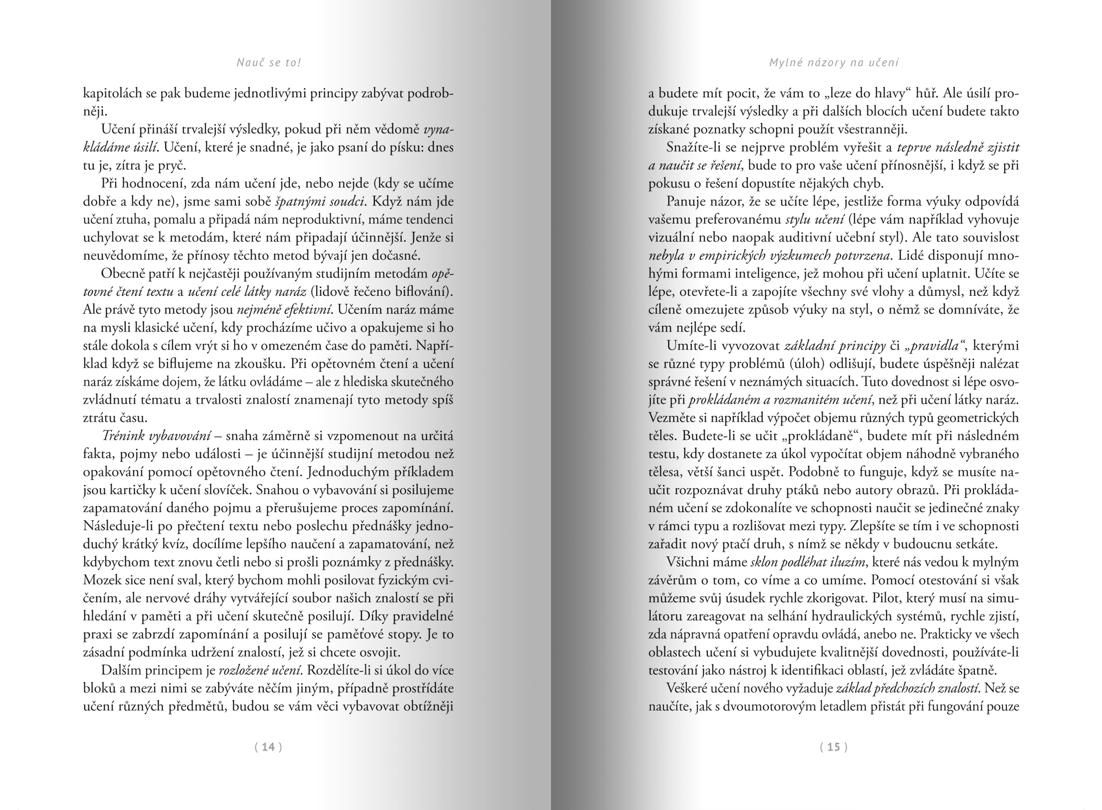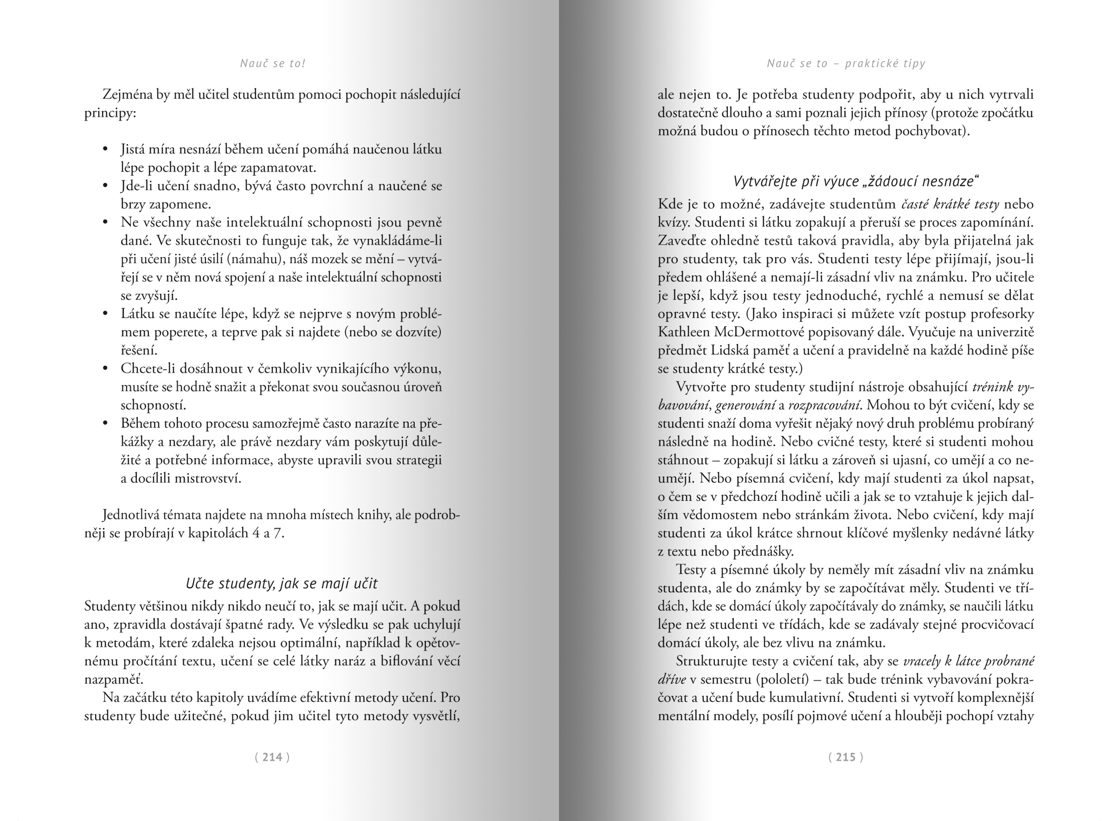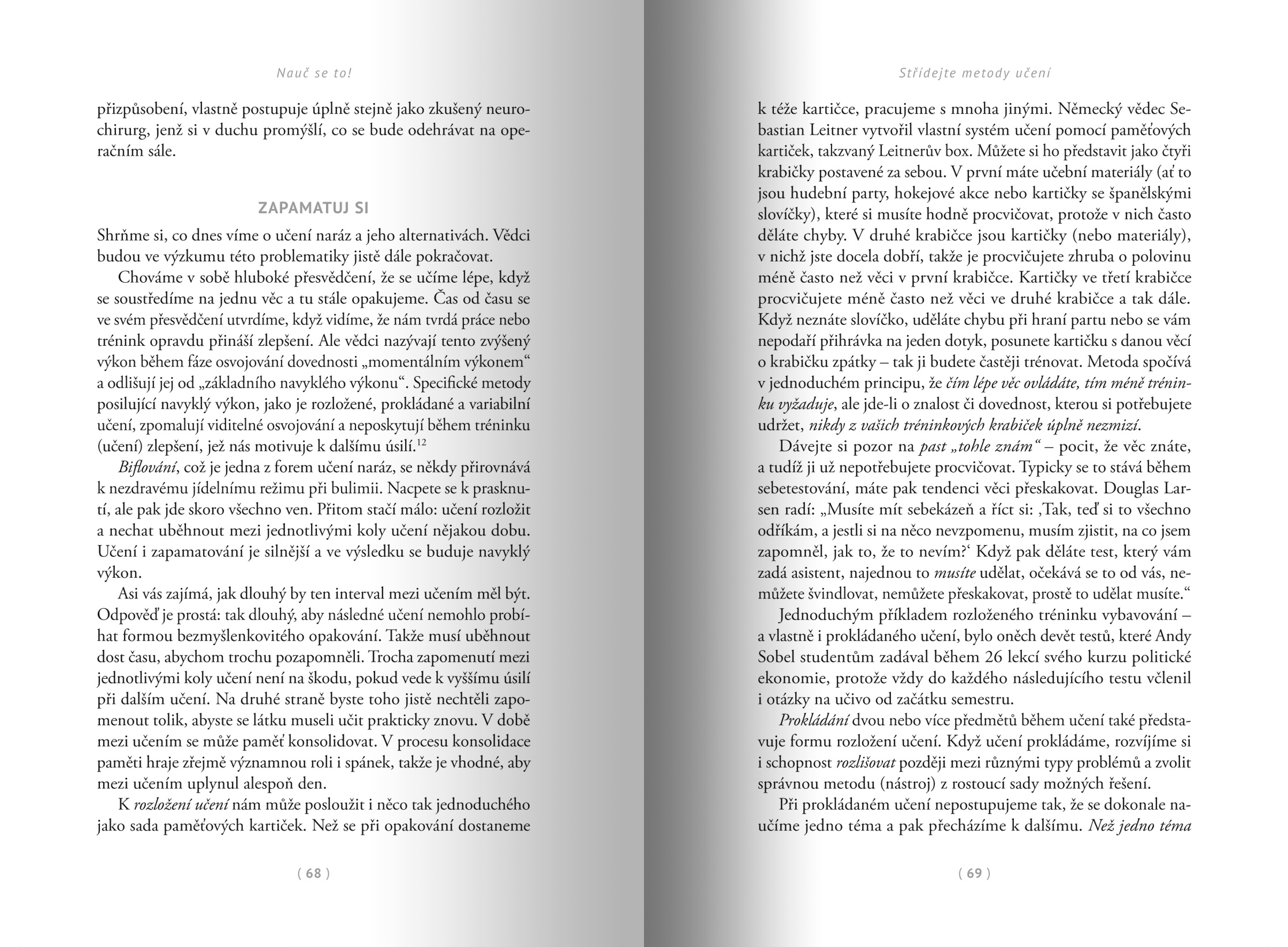 Nejrozšířenější postupy, jako je podtrhávání v textu a jeho biflování, v nás sice vyvolávají dojem, že jsme si látku výborně osvojili, ale už po krátké době z ní umíme pouhý zlomek. Hlouběji a trvaleji si ji osvojíme díky postupům, které nejsou příliš intuitivní. Jde třeba o přerušované učení (při němž látku pozapomeneme a poté se ji pokoušíme vybavit), generování (snahu vyřešit úkol předtím, než se dozvíme řešení) nebo prokládané učení (při kterém se nesnažíme jedno téma dokonale zvládnout naráz, ale záměrně ho střídáme s jinými).