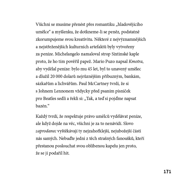 „Kniha je srozumitelná, nadmíru čtivá, její formát svádí k tomu tahat ji všude s sebou a jen tak mezi obědem si v ní listovat a podtrhávat zatím nepodtržené. Číst si ji stále dokola.“ – Dušan Potůček